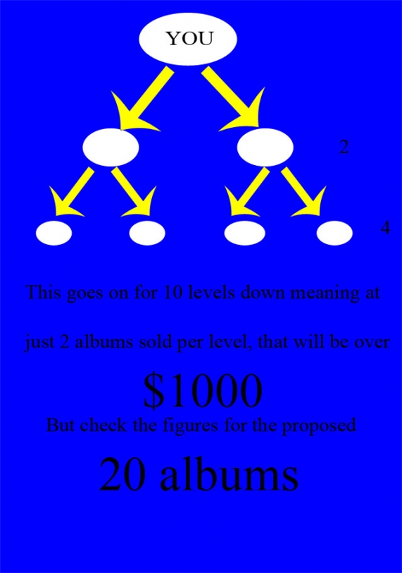 I know what you're thinking, 'These diagrams below look remarkably 'Amwayey!!'' Well I am no graphic artist so once the CD sales are chugging along nicely, I'll re do this page to help you guys out with your referrals.