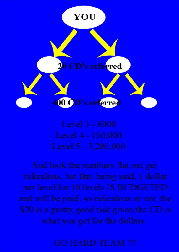 I appreciate those numbers are flat out ridiculous and I doubt whether I'll be selling 1,000,000 albums, but who knows, stranger things have happened. Be a part of the madness early and as I said, $1 per CD sold in your downline for 10 LEVELS.